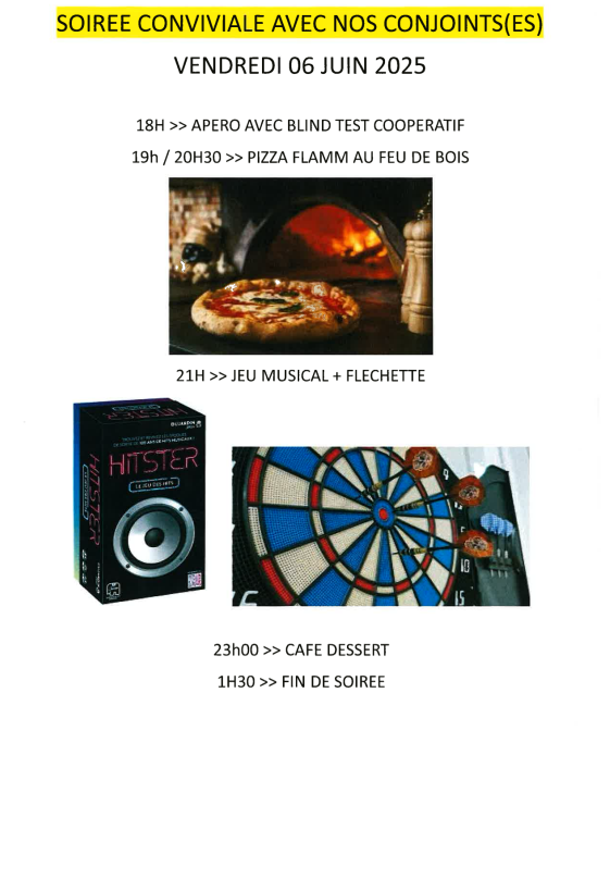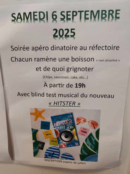 • Une autre soirée apéro dinatoire a été organisée le samedi 6 septembre 2025. Un blind test musical a fait le bonheur de